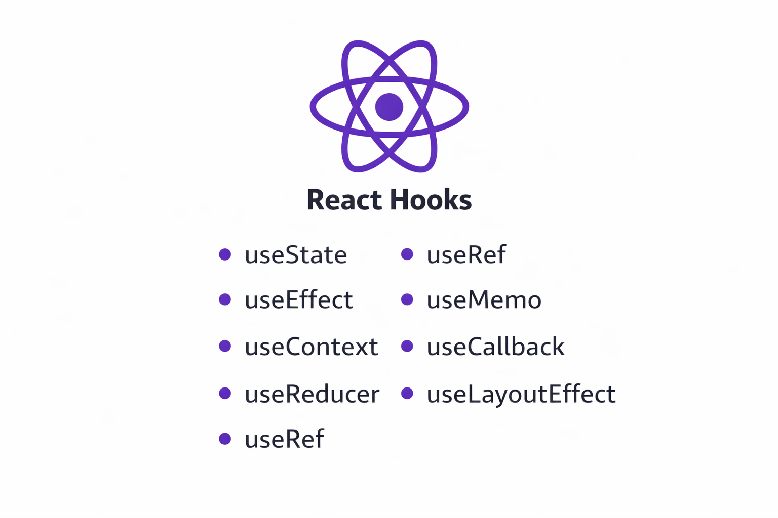 Some commonly used hooks are:useState– manage component stateuseEffect– handle side effectsuseReducer– manage complex stateuseContext– share data globallyuseRef– access DOM elementsuseMemo– optimize expensive calculationsuseCallback– memoize functions